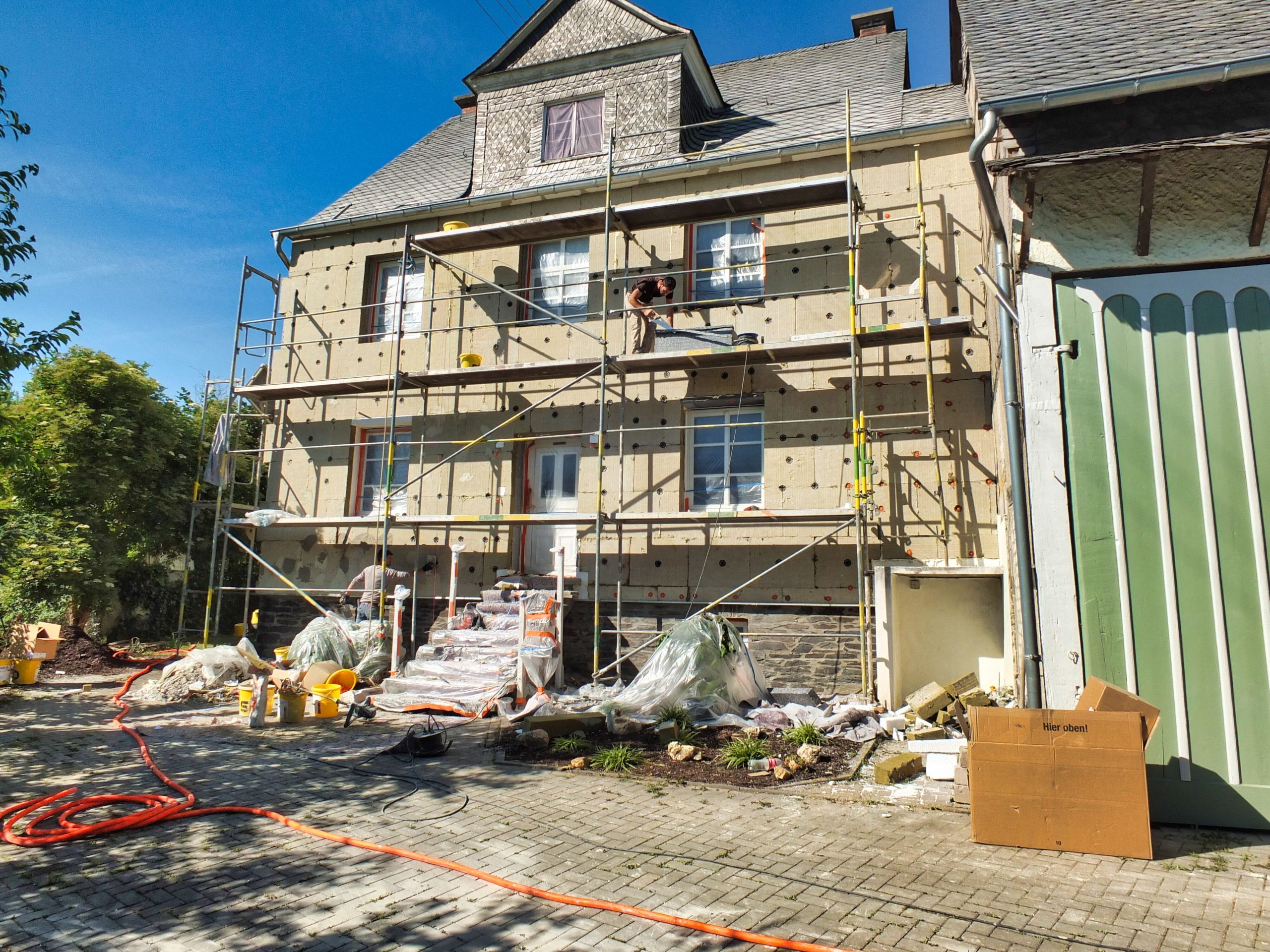 • 112 m² WDVS mit EPS abgeschlossen mit Verputz und Anstrich. Diese Maßnahme dient der Verbesserung der Wärmeisolierung und der ästhetischen Aufwertung der historischen Fassade.